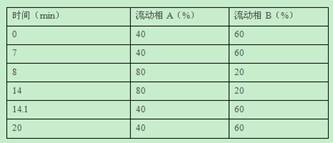 流動(dòng)相:以甲醇為流動(dòng)相A,以純水為流動(dòng)相B,按下表規(guī)定經(jīng)行梯度洗脫;