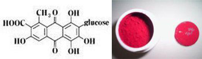 胭脂蟲紅是從生長在不同地區(qū)、不同類型的仙人掌上的胭脂蟲體內提取的一種天然色素,并且是從雌胭脂蟲體內提取的一種蒽醌衍生物,外觀呈紅色菱形晶體或紅棕色粉末,可用作食品、藥品及化妝品著色,特別是漱口劑、牙粉、撒粉、油膏,是我國認可的食品添加劑。市場上銷售的胭脂蟲紅產品也有一些是呈深紅色粘稠液體。不溶于冷水,稍溶于熱水或乙醇,能溶于堿不溶于稀酸、乙醚、氯仿、苯,在堿與稀酸中,色澤隨溶液的pH而變化,酸性時呈橙黃色,中性時呈深紅色,堿性時呈紫紅色。胭脂蟲紅的分子結構式如圖所示 :