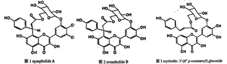 荷葉中的黃酮類化合物主要有荷葉苷,其次是次是槲皮素、異槲皮素等常見的黃酮類物質(zhì)。Awatif等從荷葉中分離出nympholide A,nympholide B和myricetin-3"-(6"p-coumaroyl)glucoside(見圖1、圖2、圖3)三種黃酮類物質(zhì)。我國荷葉資源十分豐富,從荷葉中提取的黃酮類物質(zhì)安全,無毒無害。荷葉黃酮類物質(zhì)經(jīng)試驗表明,有明顯的體外抗氧化作用,是能夠清除鏈引發(fā)階段的自由基,或(和)直接捕獲自由基反應鏈中的自由基的,能夠起到預防和斷鏈雙重作用的。